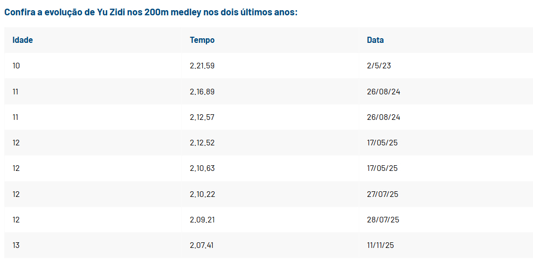 Final de ano, é hora de revisar o que foi a temporada de 2025 e o nome da chinesa Yu Zidi não pode deixar de ser mencionado. Aos 12 anos de idade ela foi três vezes quarta colocada no Campeonato Mundial de Singapura nas provas de 200 e 400m medley e 200m borboleta. Em Novembro, poucos dias depois de completar 13 anos voltou a brilhar nos Jogos Nacionais da China. Desta vez, vencendo os 200m medley com novo Recorde da Ásia, 2:07.41, segundo melhor tempo do mundo em 2025 e nona melhor nadadora da história.