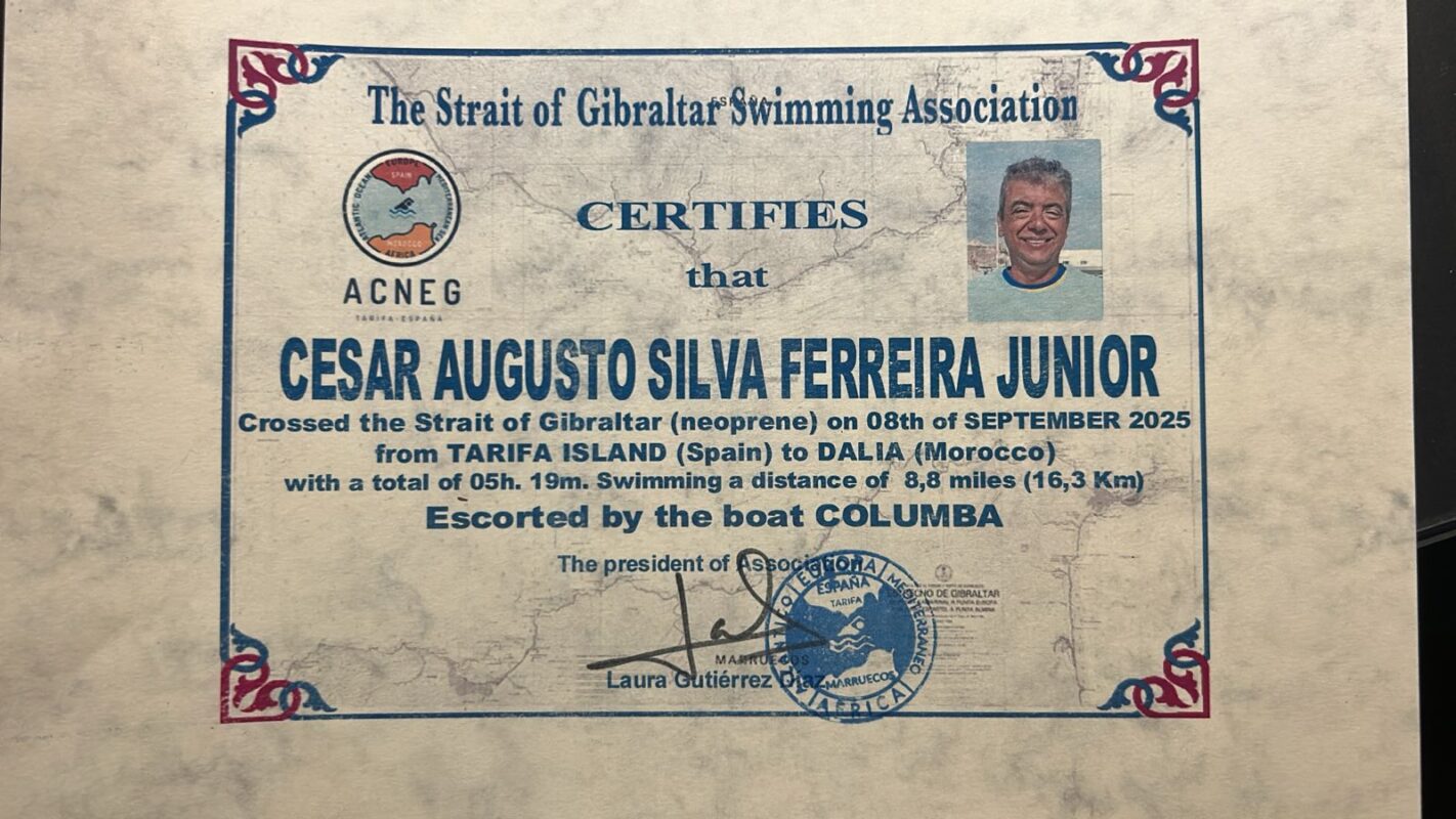 No último dia 8 de setembro de 2025, os brasileiros José Alves Siqueira Júnior e César Augusto Silva Ferreira Júnior concluíram a desafiadora Travessia a Nado do Estreito de Gibraltar, um dos percursos mais emblemáticos das águas abertas mundiais. Com percurso de 14 km, a travessia, que separa a Europa da África, foi completada com sucesso pela primeira vez pela nadadora britânica Mercedes Gleitze em 1928.
