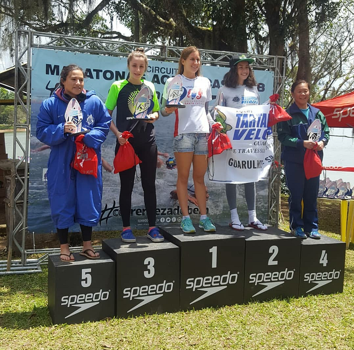 Entre as mulheres não teve chegada apertada e quem levou a melhor foi Catarina Ganzeli. A nadadora da Unisanta triunfou mais uma vez no circuito com o tempo de 50min46s28 bem a frente de Yara Rossi, das Tartarugas Velozes que concluiu os 4 km em 53min48s35. A terceira colocação foi de Vitória Farabolini da Cunzolo Acqua Fitness com tempo final de 55min01s84.