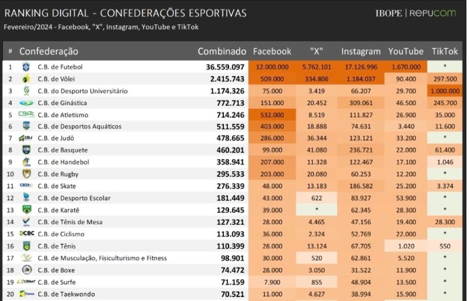 CBF, a Confederação Brasileira de Futebol é líder nacional com mais de 36 milhões de seguidores combinados. A única plataforma onde a CBF não é líder é no TikTok onde não tem conta e onde a CBDU, Confederação Brasileira de Desportos Universitários, aparece na ponta.