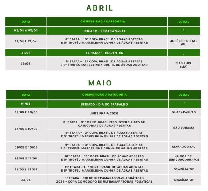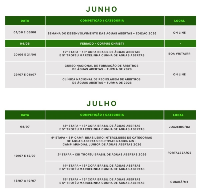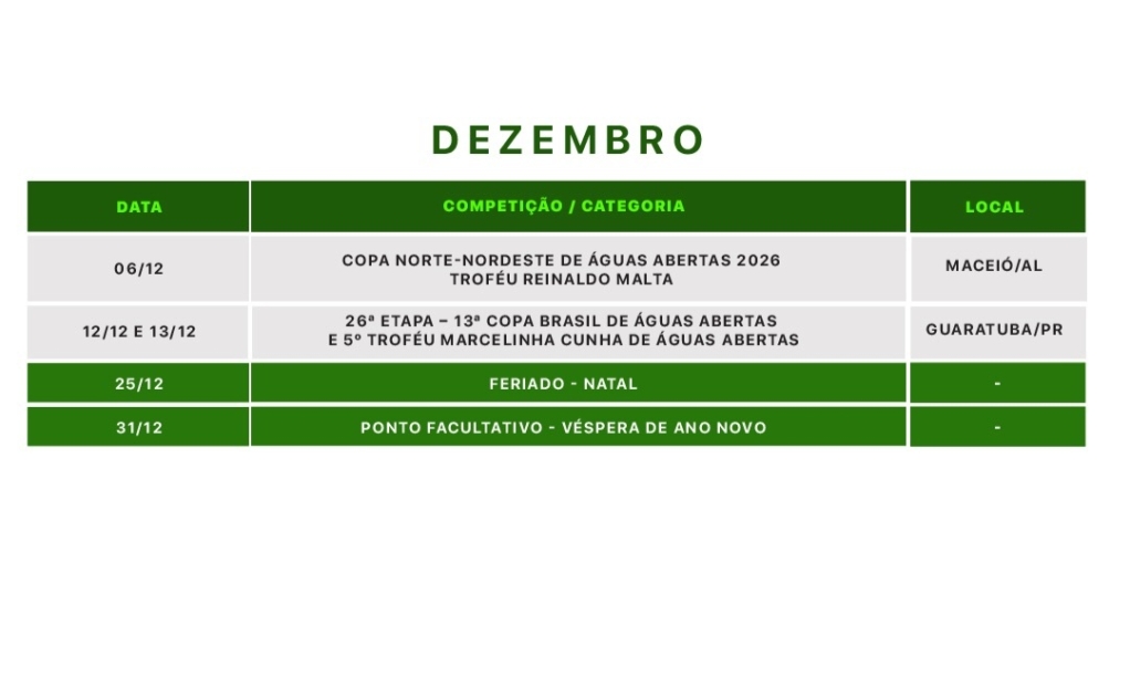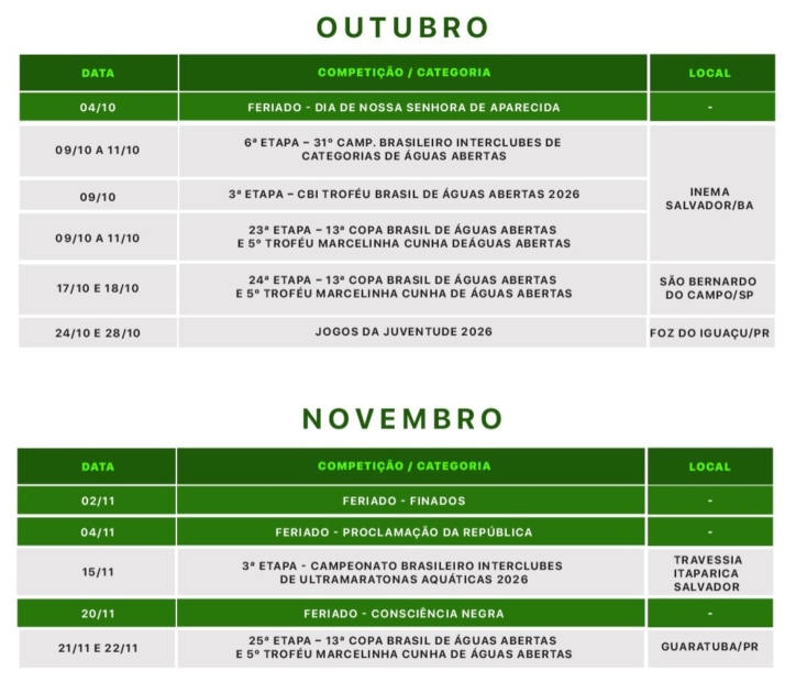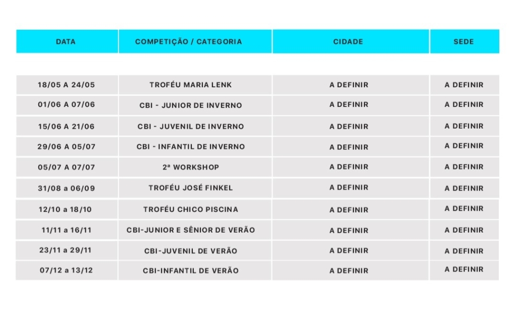A Confederação Brasileira de Desportos Aquáticos (CBDA) publicou em seu perfil no instagram, uma minuta do calendário para a temporada 2026 dos esportes aquáticos. O documento, que não apresenta as sedes dos eventos e apenas as datas, não é o oficial e mudanças ainda podem ser feitas.