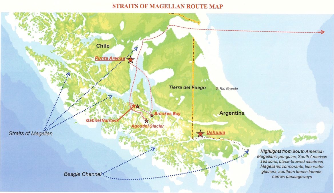 Bem pertinho dali esta localizado o Estreito de Magalhães, do lado chileno do mapa. A travessia é curta com apenas 2 km de extensão. Considerada a passagem natural mais importante entre os Oceanos Pacífico e Atlântico, fica ao sul do continente e ao norte da Ilha Grande. Este estreito tem uma rota muito difícil de atravessar devido ao clima hostil e à água extremamente gelada.