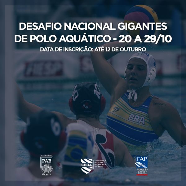 A Confederação Brasileira de Desportos Aquáticos (CBDA) com o apoio da Liga Polo Aquático Brasil (PAB) e da Federação Aquática Paulista (FAP) lançou o Desafio Nacional Gigantes do Polo Aquático. A competição tem o objetivo de motivar e promover atividades que estimulem a integração da modalidade e será feita de forma virtual entre os dias 20 e 29 de outubro.