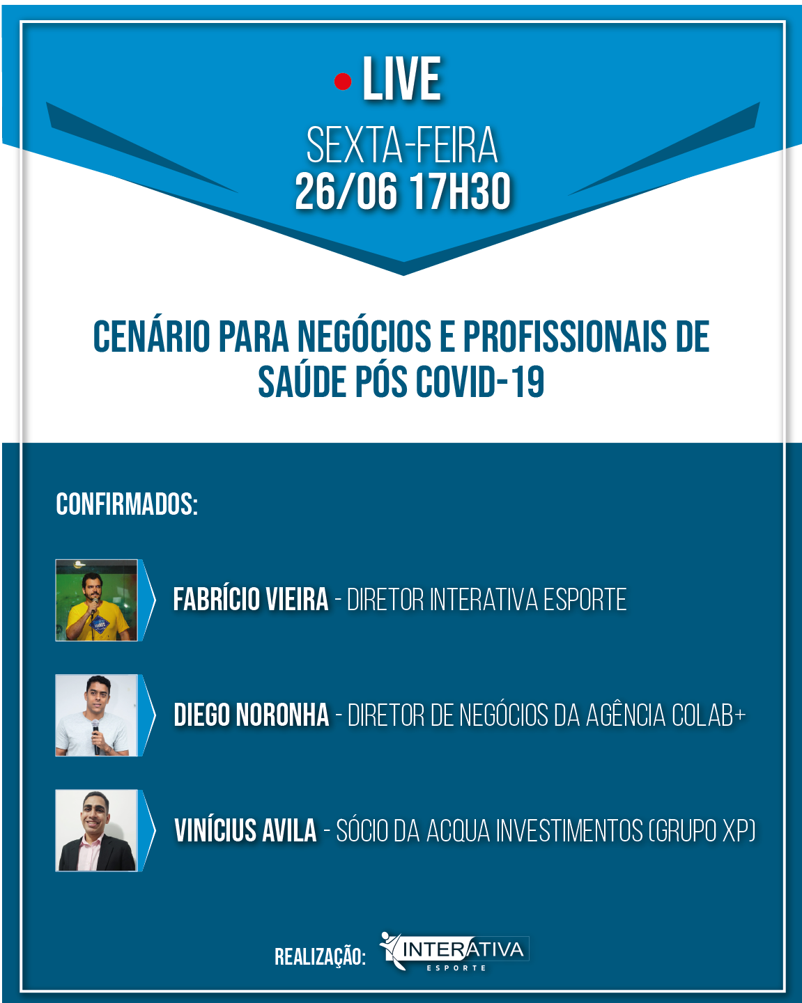 Amanhã, a partir das 17h30, a Interativa Esporte (empresa organizadora do Circuito Mares) promove um webinar com o título: Cenário para negócios e profissionais da saúde pós-COVID-19. A atração irá discutir e analisar possíveis situações para negócios após a pandemia, além de trazer conteúdos que podem ajudar profissionais neste duro cenário atual. O evento online é indicado para profissionais da saúde, autônomos e treinadores.