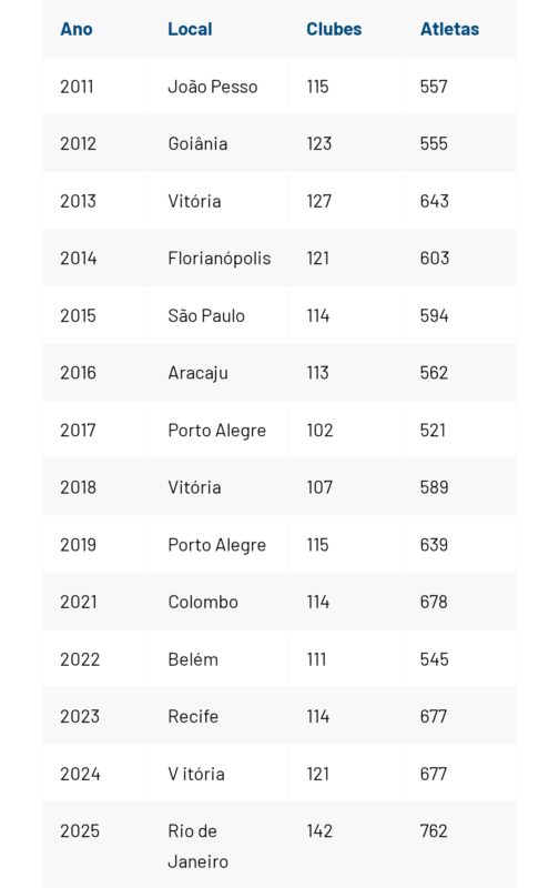 Maior número de clubes participantes (142), maior número de atletas (762), maior número de Estados (24), o Campeonato Brasileiro Infantil de Verão 2025 será histórico. Confira a evolução e registros da competição desde 2011: