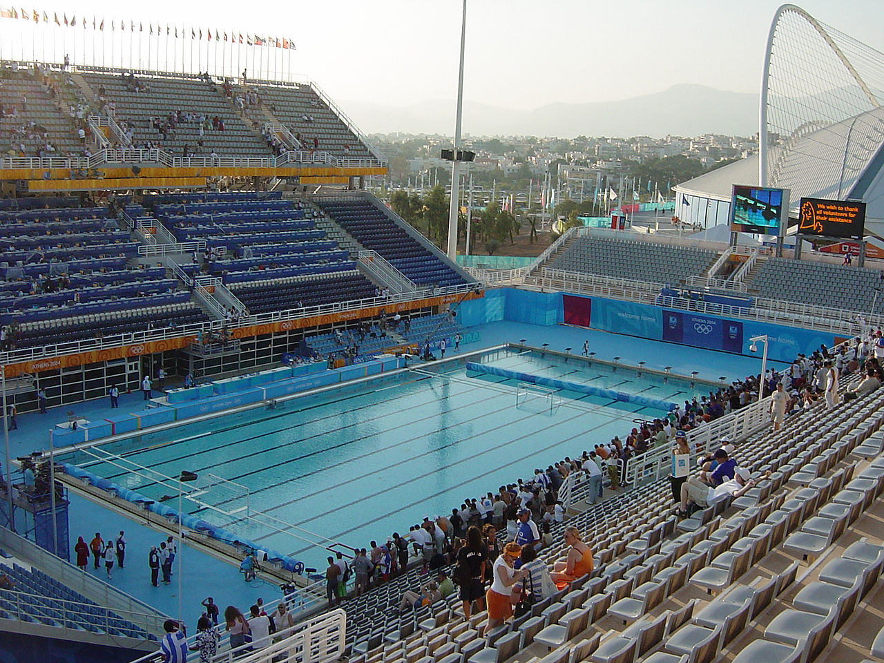 Atenas-2004: Esta piscina também não foi erguida visando os Jogos, mas depois que Atenas ganhou o direito de sediar a Olimpíada se tornou uma instalação olímpica. Rebatizada como Athens Olympic Aquatic Centre, a piscina era ao ar livre e ganhou uma cobertura nos anos seguintes. O complexo aquático foi pouco utilizado desde então, sediando raros eventos e chegou a ficar fechado por um período. Desde 2015, porém, foi reativado e passou a receber atividades de natação.