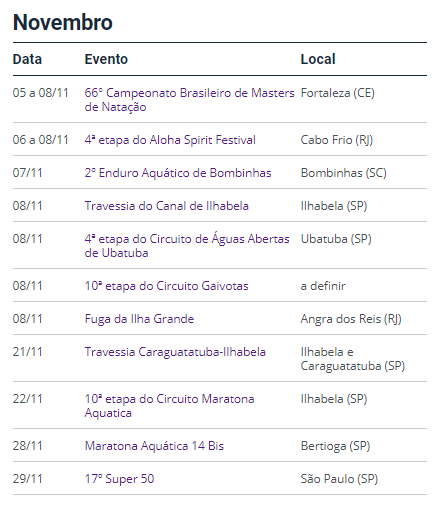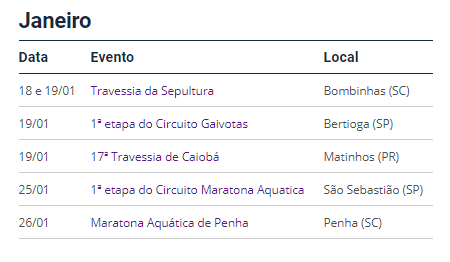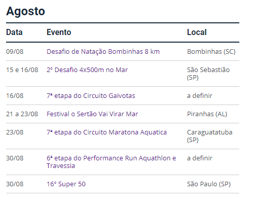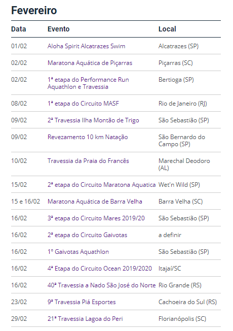 De qualquer forma damos uma ajuda a você com este texto, apresentando os principais eventos da temporada para você encaminhar para seus amigos de treino, técnicos e patrocinadores. E não deixe de conferir a aba de calendário de provas aqui no site da SWIM CHANNEL (clique aqui para ver) com todos os links de cada evento de 2020. Lembrando que futuros eventos e aqueles que ainda não tiveram datas confirmadas, serão adicionados assim que tivermos mais informações. Então monte sua agenda e uma ótima temporada de prova a todos!