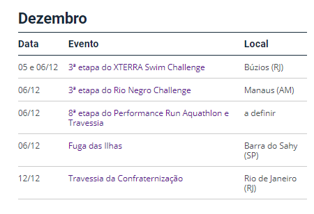 Para ajudá-lo a definir o que nadar, montamos em nosso site um calendário anual, com as principais provas da temporada e links diretos para as páginas dessas respectivas competições. Sabemos que não é fácil montar um calendário de provas. Seja para nós da SWIM CHANNEL que compilamos os eventos através de muita pesquisa e indicações, como para você nadador que precisa montar seu cronograma e definir (em alguns casos com bastante antecedência) seus principais objetivos no ano.