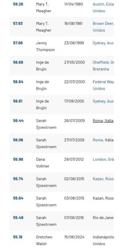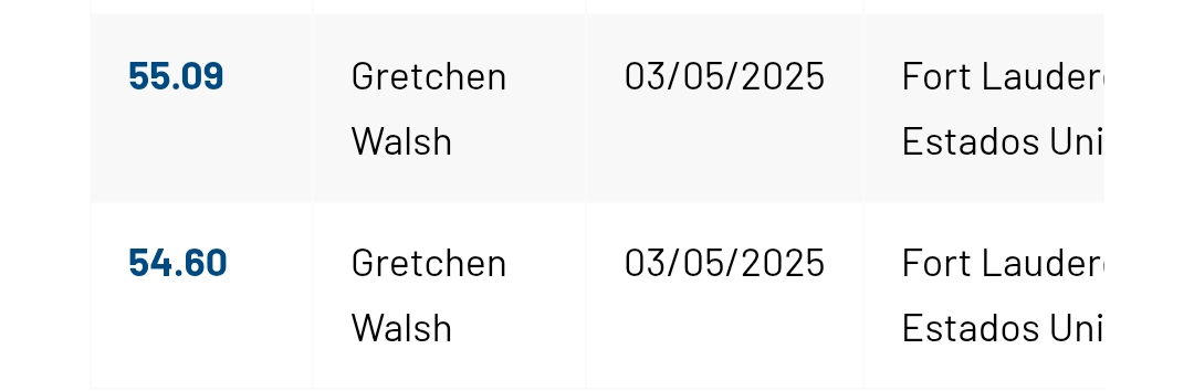 Gretchen Walsh bateu o recorde mundial dos 100m borboleta nas eliminatórias e finais do TYR Pro Swim Series em Fort Lauderdale, na Flórida, e se tornou na primeira mulher da história a nadar a prova abaixo dos 55 segundos.
