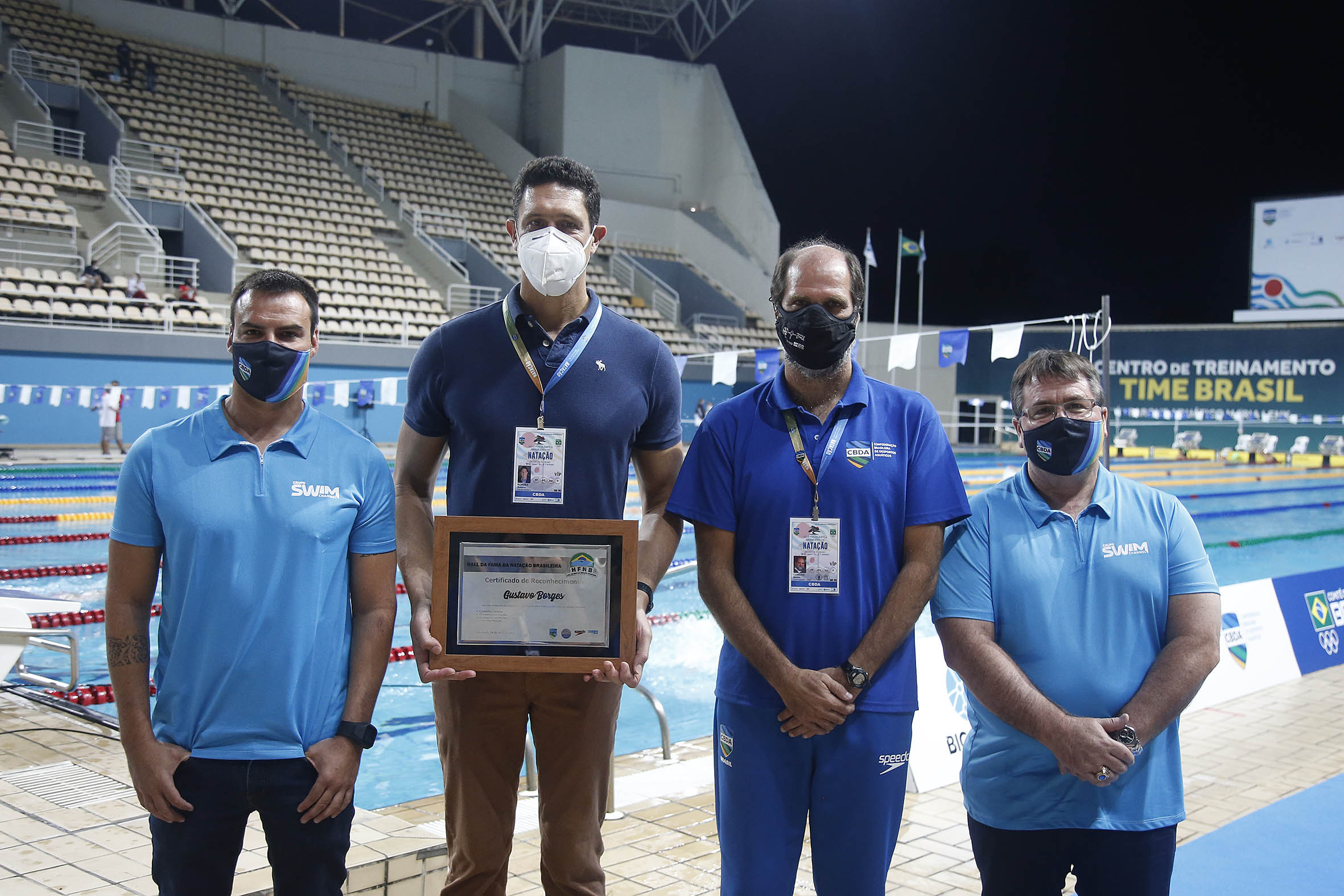 No último dia de disputas da seletiva olímpica na semana passada no Rio de Janeiro aconteceu uma justa homenagem na piscina do Parque Aquático Maria Lenk. Gustavo Borges foi homenageado pelo Hall da Fama da Natação Brasileira (HFNB) e recebeu uma placa da entidade em respeito a seus feitos nas piscinas. Agora ele faz parte da seletiva lista dos maiores ídolos da natação brasileira.