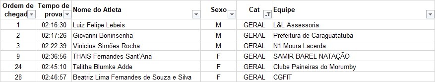 No geral individual masculino, Luiz Felipe Lebeis da L&L Assessoria se tornou tricampeão da prova com o tempo de 2h16min30, em segundo ficou Giovanni Boninsenha da Prefeitura de Caragua (2h17min26) e em terceiro Vinicius Rocha da N1 Moura Lacerda.