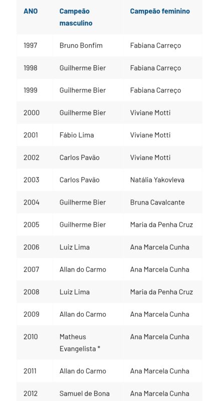 Veja a lista completa de todos os nadadores campeões brasileiros de águas abertas, levantamento do Almanaque da Natação Brasileira: